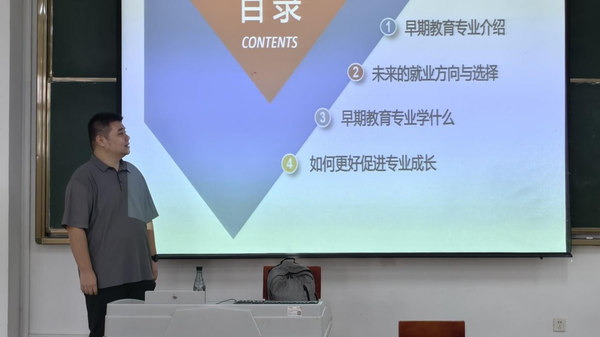 齐文辉从专业概况、就业方向、课程体系及专业成长四方面展开讲解。学前教育学院早期教育专业自2016年招生以来,实训条件完善,近三年平均就业率98.52%,人才培养成效显著。专业构建“一体设计、四阶培养、全程实践”模式,开设婴幼儿心理发展、活动设计与指导、游戏指导等核心课程,融入人文素养与创新创业模块,全面提升学生保教能力。毕业生可从事婴幼儿发展引导员、托班教师、早期教育咨询等岗位,资格证书获取率高。他还鼓励同学们积极参与技能竞赛与见习实习,通过“学、研、训”一体化在岗学习与跟岗实习,不断提升专业素养与综合能力,为未来职业发展奠定坚实基础。