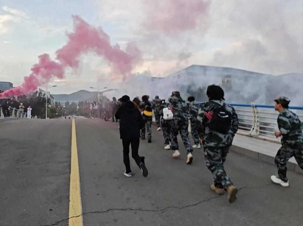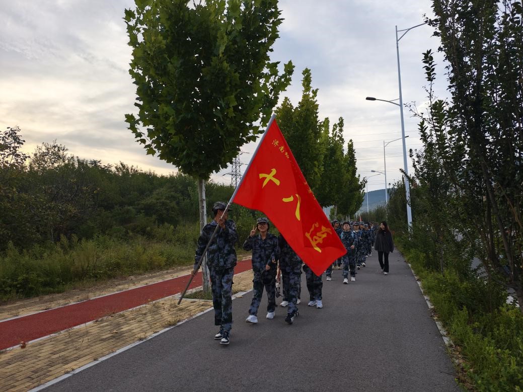 本次拉练全程15公里,路线涵盖校园与自然景观,挑战与教育意义兼具。队伍从学校东操场出发,穿越模拟“烽火线”,沿丹桂路、芙蓉路蜿蜒前行,最终抵达徕福山山顶。途中,艺术学院学子们身着迷彩服,高举红旗,以整齐的步伐和嘹亮的口号,彰显出独有的青春风采与坚韧力量。