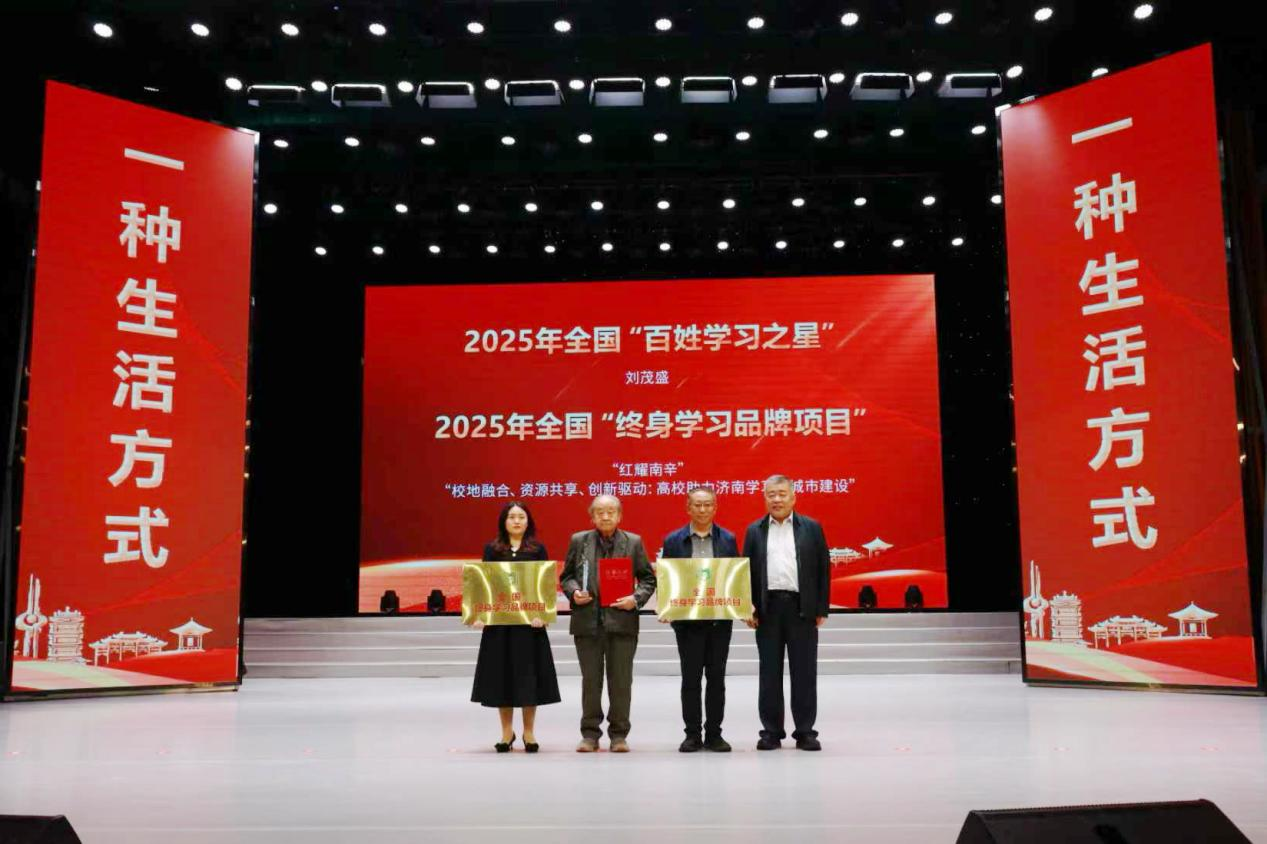 随后进行的颁奖环节,对“泉城学习之星”“泉城学习服务之星”、山东省“百姓学习之星”、山东省“终身学习品牌项目”、全国“百姓学习之星”、全国“终身学习品牌项目”等获奖代表进行了表彰。其中,我校“校地融合、资源共享、创新驱动:高校助力济南学习型城市建设”项目荣获2025年全国“终身学习品牌项目”,我校党委委员、副校长王新程上台领奖。该国家级荣誉是对我校在终身学习领域持续投入与创新实践的高度认可。