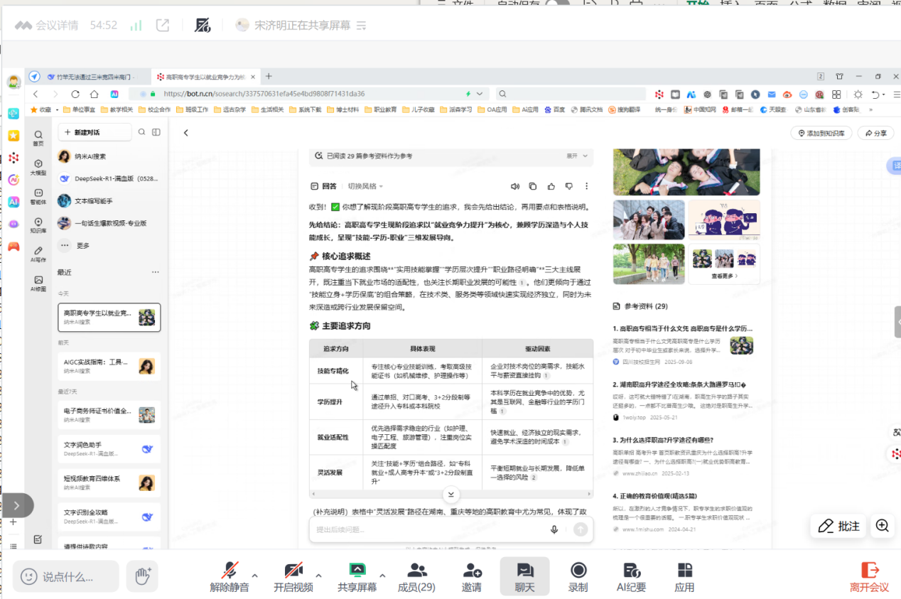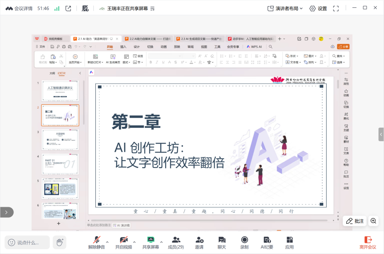 为进一步落实《人工智能基础》课程建设要求,统一教学标准,优化教学内容,提升教学质量,我校于2025年10月15日晚,通过腾讯会议线上方式组织召开了《人工智能基础》课程第二次集体教研会议。会议由教务处处长池海主持,全体承担该课程教学任务的授课教师参加。