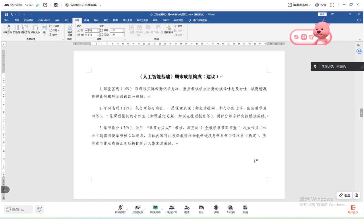 信息商务学院副院长宋济明随后就课程成绩分配方案及得分情况作了详细说明,明确了平时成绩、实验作业与期末考核的权重比例。他特别强调,在AI辅助教学过程中,教师需引导学生注意人工智能工具的使用规范,并现场举例说明“AI生成内容仍存在局限性,需结合人工审校与修改”,体现“人机协同”中人的主体性与责任意识。