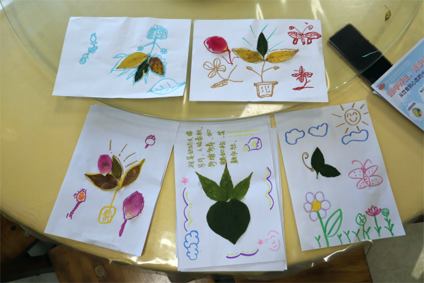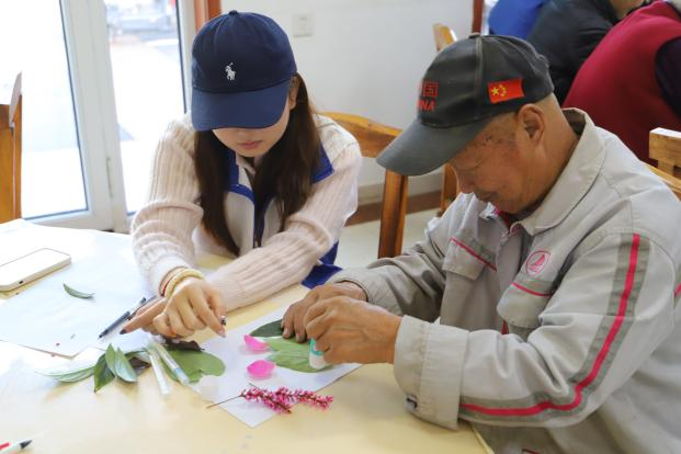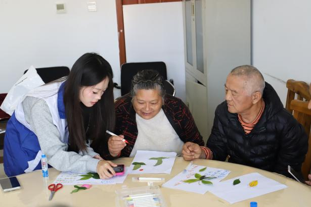 活动现场温情满满,志愿者们以“健康守护、情感陪伴”为核心,依托三项特色服务,为老人们打造了一场兼具趣味与实用性的暖心活动。“拾叶绘秋意,巧手下生花”环节里,志愿者提前备好形态各异、色彩斑斓的完整树叶,与老人一对一结对。从帮老人挑选心仪树叶,到引导他们发挥想象拼贴创作,志愿者全程耐心陪伴、倾听老人的故事,共同完成树叶绘画作品,让其成为承载秋日记忆的专属纪念。