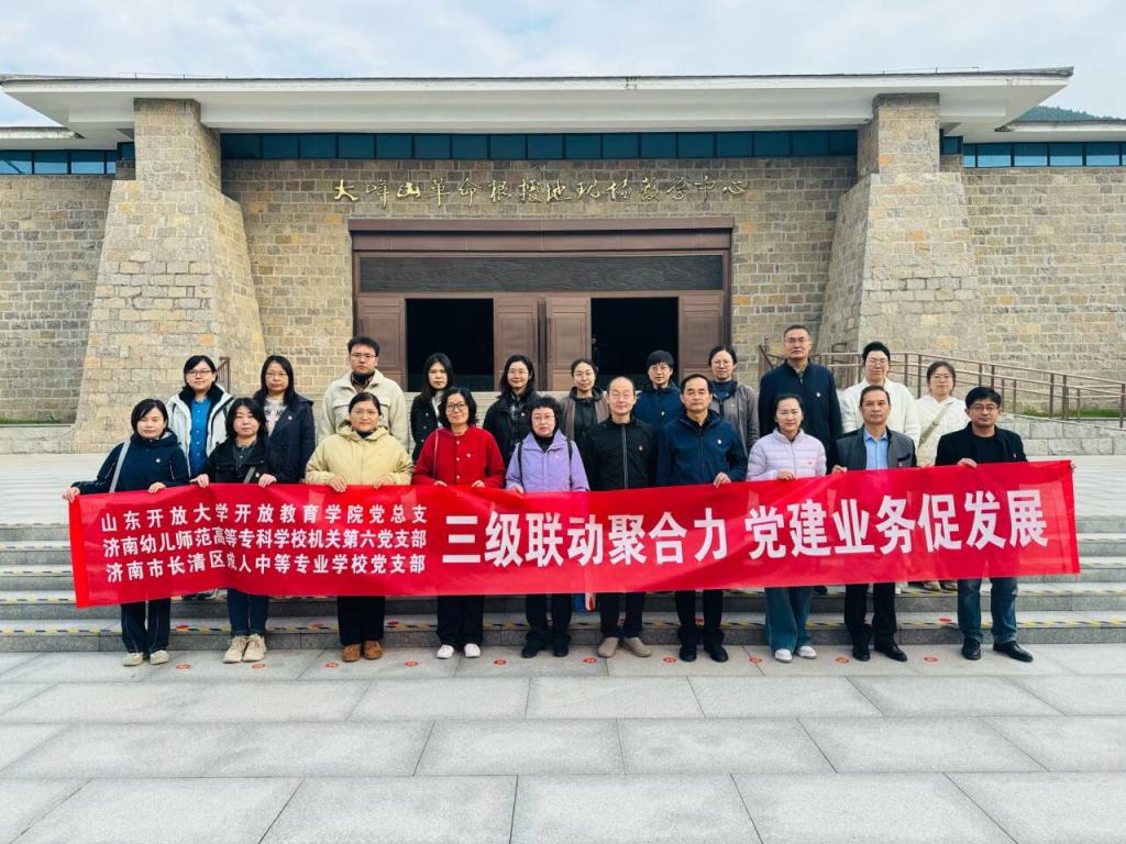 为深化党史学习教育,强化党员党性修养,激发党员干事创业热情,10月23日上午,山东开放大学开放教育学院党总支、我校机关第六党支部、长清区成人中等专业学校(长清开放大学)党支部三级联动组织党员同志赴大峰山党性教育基地,开展“传承红色基因 凝聚奋进力量”主题党日活动。通过实地参观、重温入党誓词、座谈交流等形式,全体党员接受了一场深刻的红色精神洗礼。