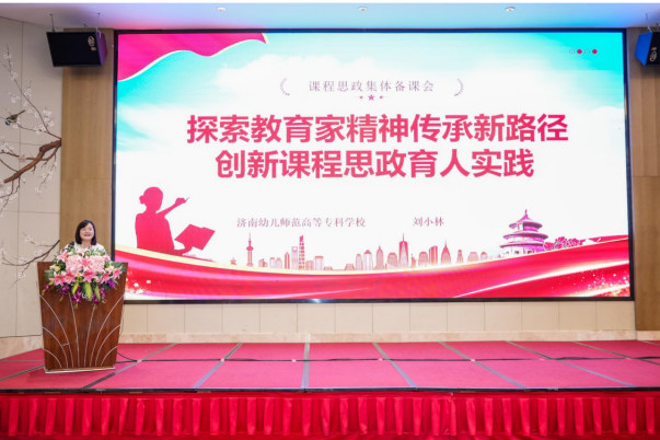 在案例分享与思政启思环节中,刘小林作了题为《探索教育家精神传承新路径创新课程思政育人实践》的专题报告。报告紧扣会议主题,系统介绍了学院将百年红色师范传统、王尽美革命精神与当代教育家精神融入课程思政的特色路径。报告从院校层面“三阶递进·双链共生”育人体系、专业层面“四轮驱动”的工作机制,到课程层面国家级精品课程《幼儿教师口语》的创新实践,层层递进地展示了可复制、可推广的经验,为全国同行提供了实践范本。报告内容翔实、创新性强,获得了与会代表的高度评价和热烈讨论。