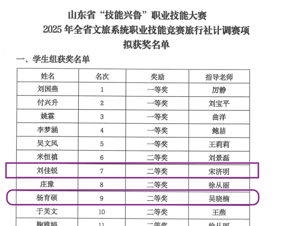 信息商务学院研学旅行管理与服务专业学子刘佳锐、杨育硕,在宋济明院长、曾静老师、吴晓楠老师的悉心指导下,凭借扎实的专业功底、创新的实践思维与沉稳的临场表现,在众多参赛选手中脱颖而出,双双斩获学生组二等奖。与此同时,宋济明、吴晓楠两位老师因指导成效显著,获评“优秀指导老师”;济南幼儿师范高等专科学校凭借周密的备赛组织、高效的赛事参与,荣获“优秀组织奖”,多项荣誉的斩获是对研学专业人才培养工作的充分肯定。