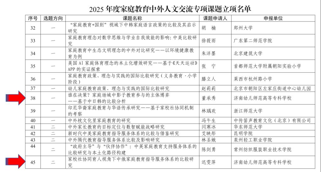 近日,教育部中外人文交流中心课题立项结果正式公布,我校董承秀老师主持的《谁在决策?家庭场域中影子教育参与的主体博弈——基于中日韩的比较分析》和迟雯萍老师主持的《家校社协同育人视角下中俄家庭教育指导服务体系的比较研究》成功获批。此次立项是我校在教育部中外人文交流中心纵向课题申报工作中的首次突破。