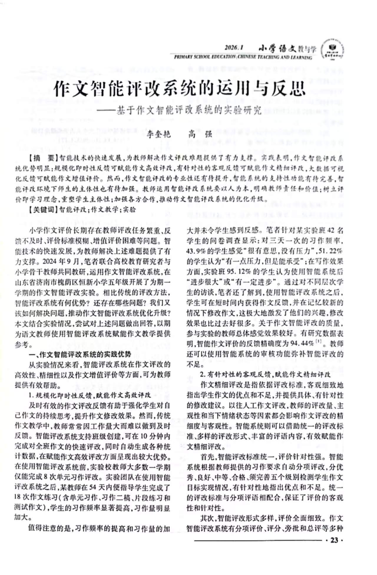 近日,我校儿童阅读研究所李奎艳与济南市槐荫区恒新小学高强联合撰写的论文《作文智能评改系统的运用与反思——基于作文智能评改系统的实验研究》(原刊北大核心期刊《语文建设》2025年第2期),成功被人大复印资料《小学语文教与学》2026年第1期全文转载。这一成果标志着我校在人工智能与语文教育融合研究领域的探索获得学界高度认可,彰显了相关研究的实践价值与学术影响力。作为被誉为“中华学术的窗口”的权威学术品牌,人大复印资料在国内外具有广泛影响力与核心竞争力。其转载论文均经过严格的学术筛选,代表相关领域的前沿研究水平与核心学术价值。此次论文成功入选转载,是对我校研究成果创新性、科学性与实践指导性的充分肯定。近年来,我校儿童阅读研究所团队深耕人工智能与语文教育融合领域,研究实力稳居全国领先行列。团队成果丰硕,已发表相关学术论文6篇(含核心期刊论文3篇),主持省级科研项目3项,出版融媒体数字教材1部,相关成果还荣获中国教育技术协会教育创新成果三等奖,为语文教育数字化转型提供了扎实的理论支撑与实践路径。此次成果转载是我校推进有组织科研的重要突破,将进一步提升学校在教育数字化领域的学术影响力。我校将以此为契机,持续深化人工智能与语文教育融合研究,产出更多高质量科研成果,为助力学校创优升本、推动基础教育高质量发展贡献坚实力量。