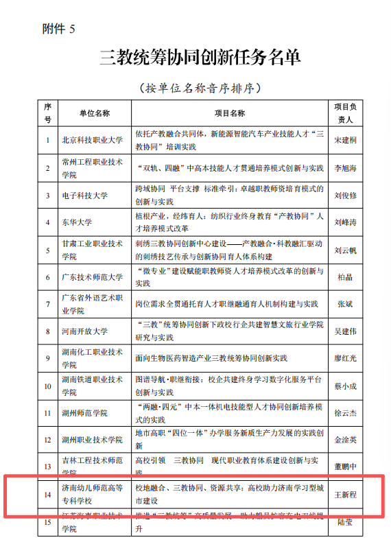 1月19日,教育部公布《第三批高等继续教育领域学习型社会建设重点任务名单》。由济南幼儿师范高等专科学校组织申报的“校地融合、三教协同、资源共享:高校助力济南学习型城市建设”项目(以下简称“高校支持网络”项目),成功入选“三教统筹协同创新”任务名单,标志着我校在服务全民终身学习、推动职业教育、高等教育与继续教育协同发展方面迈入国家级建设序列。