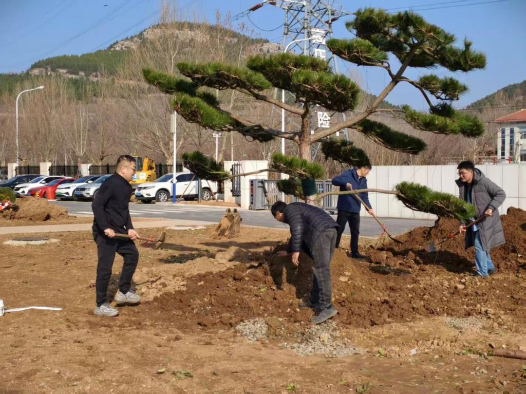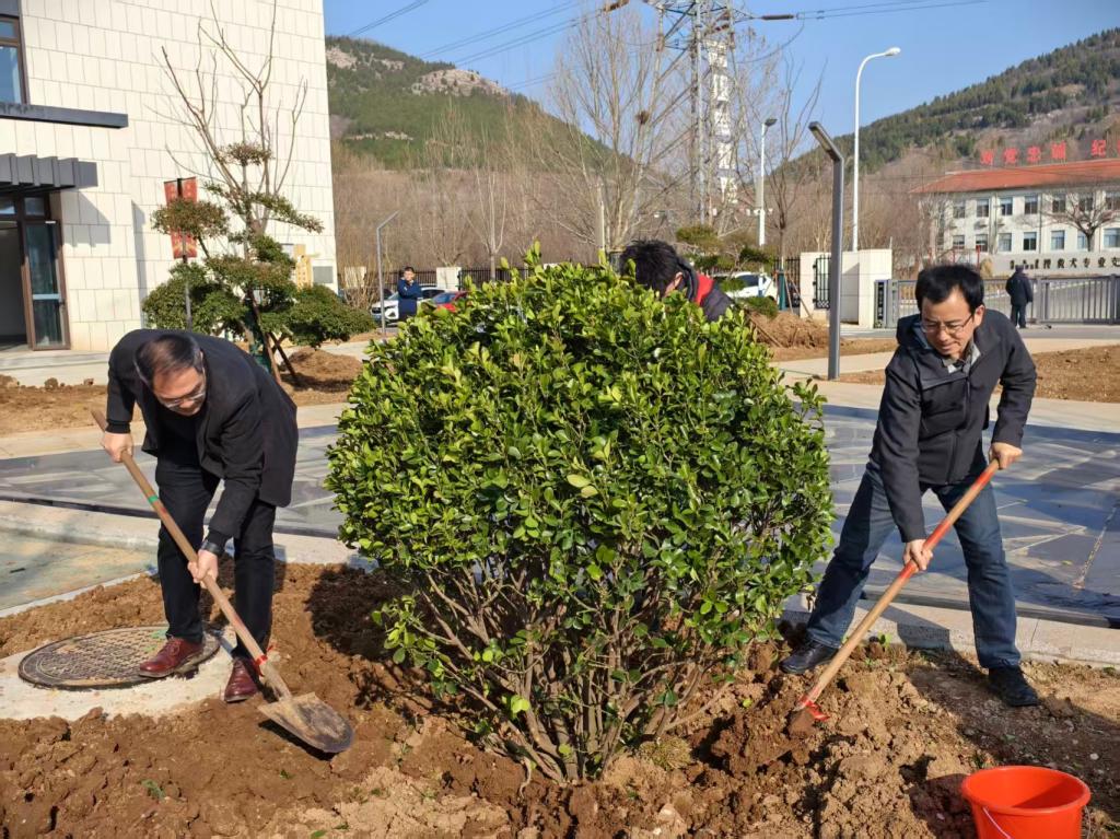 活动现场,暖阳高照,干劲十足。参与人员分组协作,挥锹铲土、扶苗正干、培土压实、提桶浇水,每一道工序都细致规范。学校领导及学生志愿者们并肩劳作,一边栽种紫薇、松树等苗木,一边交流新校区建设与绿化养护细节,现场氛围热烈而有序。