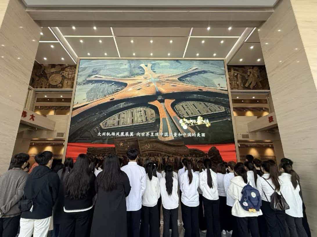 在劳动精神馆,师生们深刻感悟劳动创造历史、实干成就伟业的磅礴力量,通过一件件实物、一幅幅影像,重温红旗渠修建、大国重器研制等重大建设历程,真切体会劳动者不畏艰难、拼搏奉献的奋斗底色。在山东馆,大家驻足观看、认真聆听,深入领略齐鲁大地厚重的历史文脉与新时代山东高质量发展的崭新风貌,直观感受山东在传承弘扬劳模精神、劳动精神、工匠精神中的生动实践与丰硕成果。参观临近尾声,全体党员面向党旗庄严举起右拳,重温入党誓词,铿锵誓言回荡现场,进一步坚定了理想信念,强化了为党育人、为国育才的使命担当。