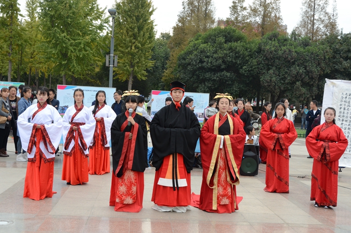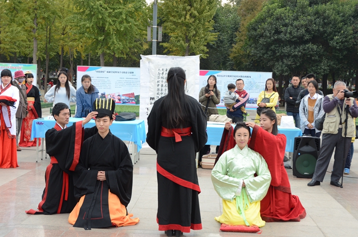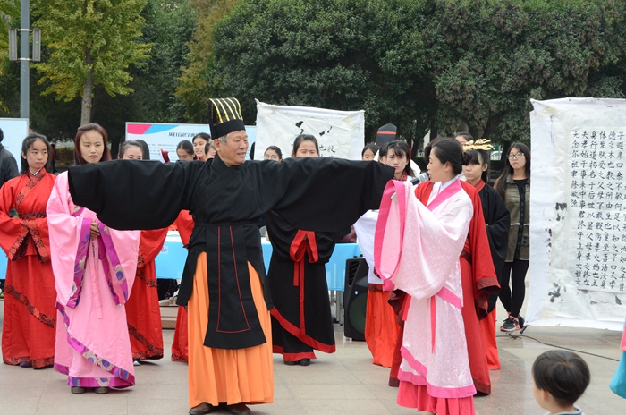 本次活动虚静国学研究会共有二十名师生参加,由初等教育学院于琮老师带队,主要展示了揖礼和成人礼(男子的冠礼和女子的笄礼)。师生们在三次加冠和加笄的过程中,通过不同的服饰展示,向现场的市民介绍我国传统礼仪文化。