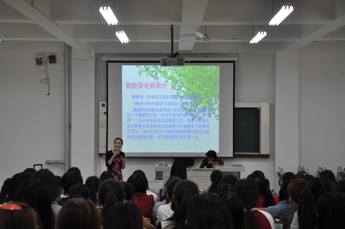 本次活动还特别聘请了原济南幼师89级校友—济南军区政治部幼儿园郭新荣主任为同学们做讲故事示范并现场解答同学们的问题。郭主任丰富的教学经验,深厚的语言功底和极富感染力的讲述给大家留下了深刻的印象,使同学们深受启发、获益匪浅。