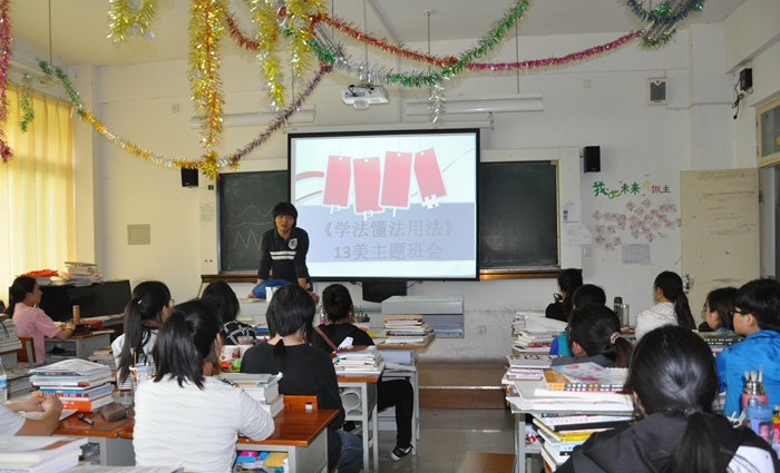 在推进依法治校动员大会后,为加强学生的法治教育,提高学生的法律意识,进一步推进依法治校和平安和谐校园建设,学生工作处面向学生开展了一系列教育活动。4月27日下午,全校范围内统一安排法治教育主题班会,学生工作处领导和学院干部深入班级参加了主题班会。