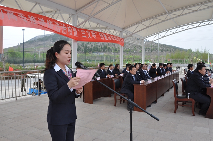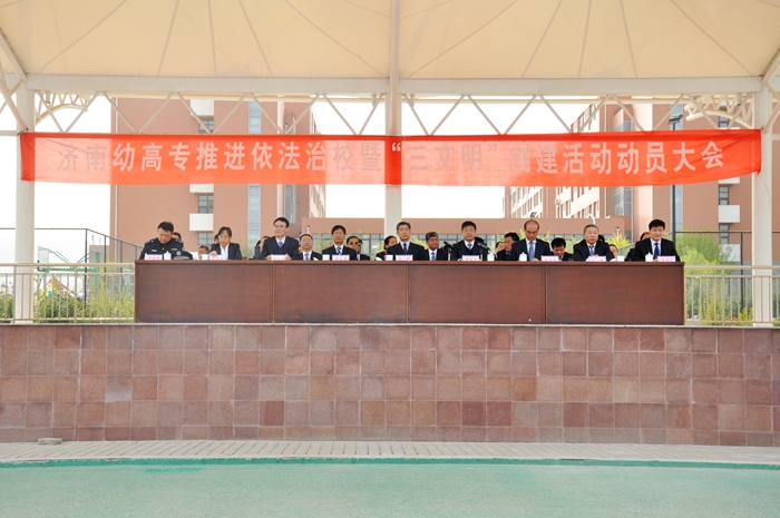 为全面推进依法治校工作,4月17日下午,我校召开了推进依法治校暨“三文明”创建活动动员大会。动员大会在总校区运动场举行,全体教职工和在校学生参加了大会。大会还邀请了济南康桥律事务所和大学路派出所有关领导参加。会议由校长黄祖杰主持。