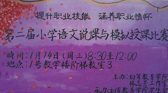2015年1月14日上午,我校初等教育学院成功举办“第二届小学语文说课与模拟授课”比赛。本次比赛由林志芳工作室组织筹办,比赛分为预赛和决赛,来自13级高起专和11级普师班的24名同学参加比赛,200多名同学到场学习。