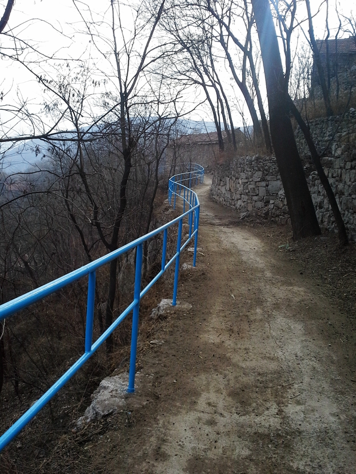双水泉村位于章丘南部山区,整个村建在一条狭长的山谷中,村民的房子都是依山而建,最高处和最矮处房屋落差达百米,近半房屋建在崖边,离屋门不到3米就是十几米深的悬崖。尤其是村内两条次干道,道路宽不过2米,南侧就是悬崖。虽然有的村民已在此生活多年,但走在这两条路上,白天都很紧张,生怕脚下打滑,更不说晚上了。还有村内的6个蓄水池,最高处离地面几十米,取水口距池边近在咫尺,但池顶无任何防护。村民们一直盼望能在村内危险路段安装护栏,村委会也多次下决心解决这个问题,但苦于没有资金,一直未能如愿。