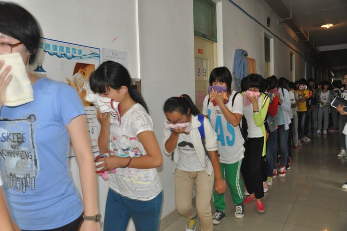 9月13日下午2点30分,我校举行2014级新生应急疏散演练。随着报警哨声急促响起,2014级新生在疏散引导员的引导下快速、有序地撤离疏散,各班新生按照指定的疏散线路“逃生”,安全撤离到田径场。各班新生集合完毕,引导员清点人数,向疏散演练副总指挥王利进行汇报,王利副总指挥就此次疏散演练做了简短的总结:这次演练,从“火情”警报发出,至疏散撤离到田径场,用时2分30秒,基本达到了让同学们熟悉疏散线路,掌握疏散逃生方法的目的,请同学们在今后的日子里更加珍爱生命,重视安全,快乐健康地成长。