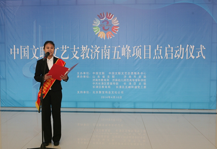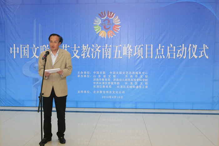 济南市文联党组书记、副主席刘溪在讲话中也希望志愿者自觉践行“爱国、为民、崇德、尚艺”的文艺界核心价值观,大力弘扬“奉献、友爱、互助、进步”的志愿精神,利用自己所学,发挥自身特长,用艺术的雨露滋润孩子们的心田,用爱心传递出志愿服务的正能量,努力为学生们送去精神食粮,送上温馨和欢乐。