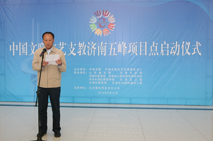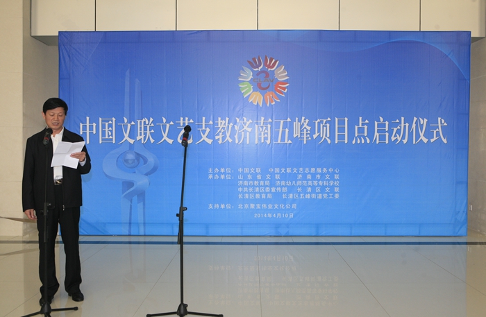 4月10日,中国文联文艺支教济南五峰项目点启动仪式在我校隆重举行。参加启动仪式的有山东省文联党组成员、副主席、中国文艺志愿者协会理事、山东省文艺志愿服务团团长顾亚龙;山东省文联组联部主任王宇鹏;济南市文联党组书记刘溪;济南市教育局副局长朋星;济南市教育局体卫艺处副处长程梅;我校党委书记高斌、校长黄祖杰;长清区委宣传部长孙静;长清区五峰镇五所受援学校校长等。启动仪式由济南市文联党组成员、副主席王振范同志主持。
