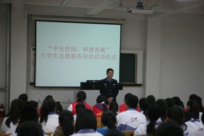 10月24日下午,我校“平安校园、和谐发展”大学生志愿服务活动启动仪式在阶梯教室隆重举行,标志着“治安志愿者”全面参与学校安全教育和管理的序幕已经拉开。长清公安分局政委、大学路派出所教导员、长清消防大队上尉、市教育局安全处长、我校有关领导参加了启动仪式。