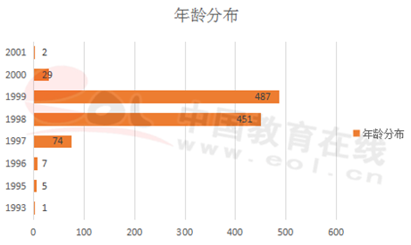 高考录取的1056名新生中,1999年出生的同学人数最多,共计487人,占比46.11%;“00后”共有31人,占总人数的2.94%。