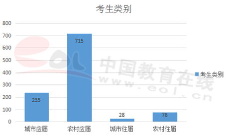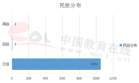 高考录取的1056名新生中,分别来自三个民族。其中,汉族新生人数最多,一共1052人,回族新生有3人,满族新生1人。
