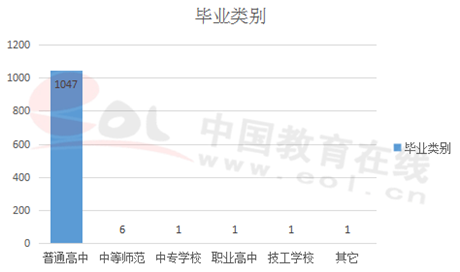 今年毕业生来源最多的还是普通高中,共有1047人。来自中等师范的新生有6人,另外,来自中专学校、职业高中、技工学校的学生各有1人。