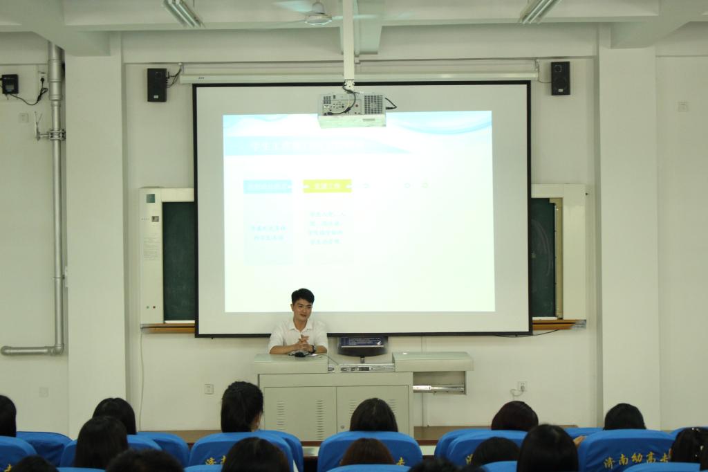 孔令浩然主任从具体的学生管理工作出发,介绍了与新生息息相关的五部分内容,包括学生工作部门的主要职责、学生考核制度、团学组织概况、学生社团、学院学生活动。让新生了解学院如何进行日常考评及奖学金评定等,希望新生以此作为参考来严格要求自己顺利完成学业。孔主任还以图文并茂的方式向新生展示学校及学院的社团活动,并鼓励同学们在校期间可以积极参加学团组织的各项活动,不仅可以丰富课余生活,同时也是对自己所学专业知识的检验。