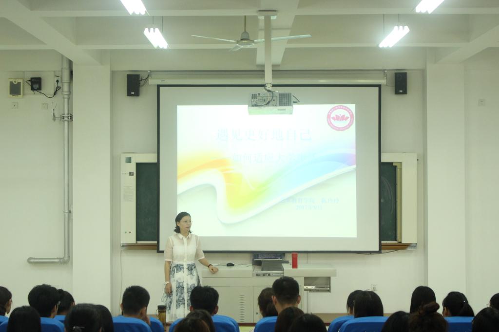 陈玲玲副书记以“遇见更好的自己——如何适应大学生活”为主题展开,首先她提出六个问题,引导新生思考大学生活将如何度过。结合英怀特海的名言引出所要讲解的四个板块,让新同学了解在大学期间如何调整心态,学会独立;如何确立目标,学会学习;如何拓宽领域,学会交往;如何丰富生活,学会思考。讲座过程中,陈书记结合学院优秀毕业生的案例以及寓言故事,深入浅出的与新生探讨大学期间将如何充实自己。最后,她给新生五点建议,在校期间可以多去图书馆、参加校园活动、参加社会实践活动、做有意义的兼职、考取专业证书,同时鼓励新生不忘初心,方得始终。