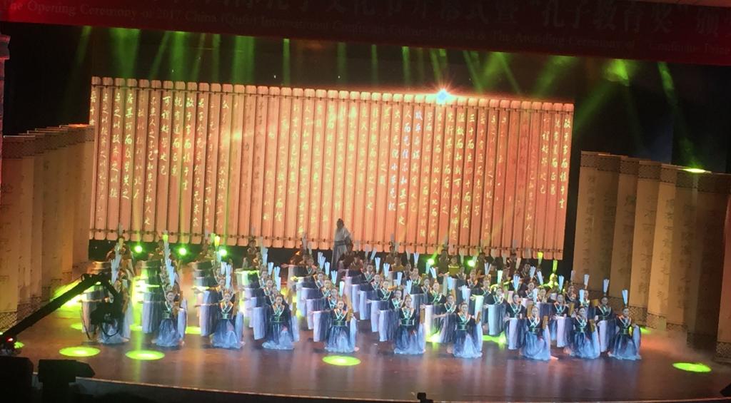2017中国(曲阜)国际孔子文化节开幕式暨第十二届“联合国教科文组织孔子教育奖”颁奖典礼,于9月27日晚在孔子故里山东曲阜举行,我校62名学生参加了晚会4个节目的演出。