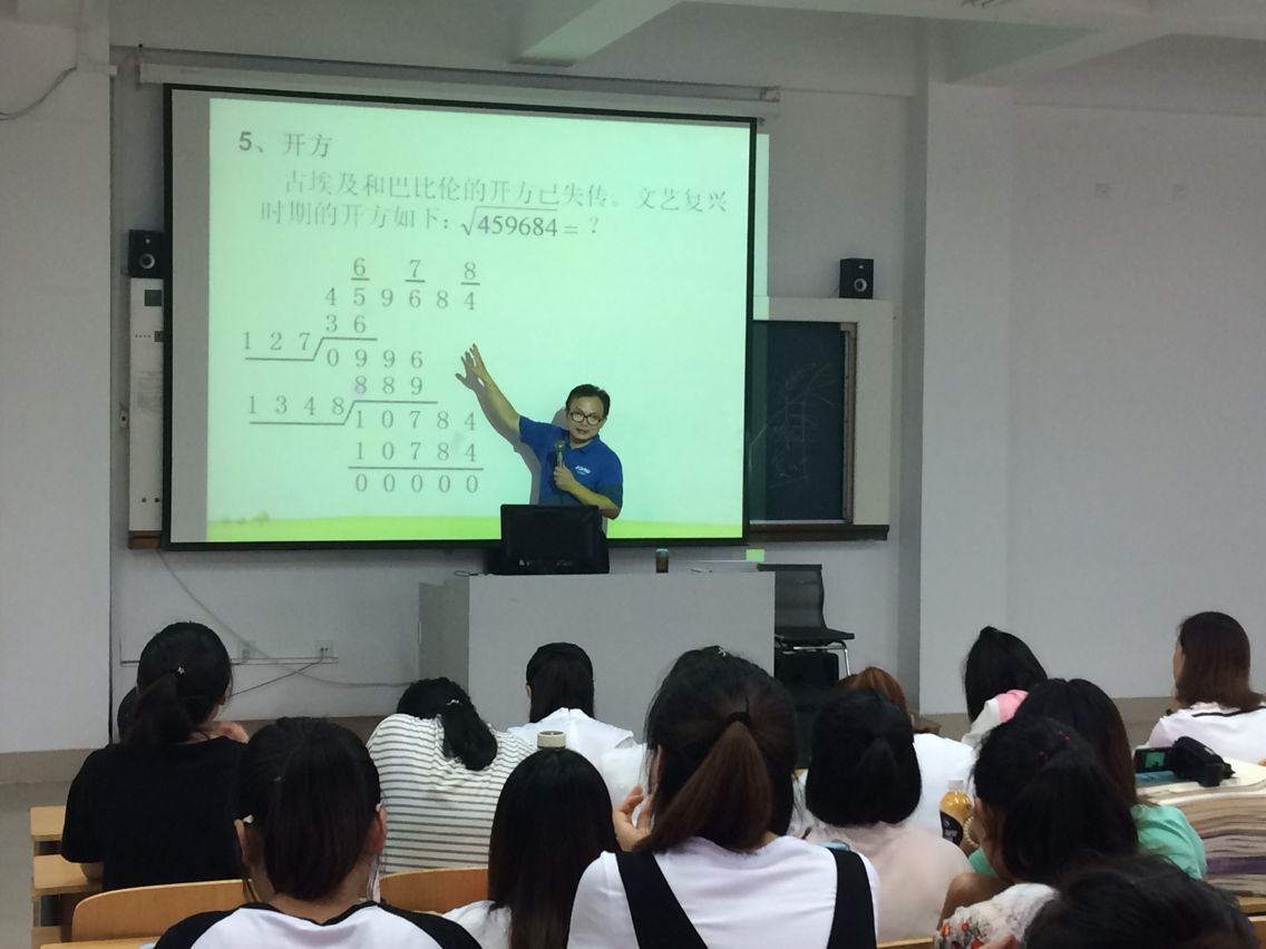 杨老师通过精心制作的多媒体课件展示,声情并茂地讲解了西方数学符号的发展历史以及四则运算的由来,让同学们感受到简单的数字和运算背后竟有这样悠久而又漫长的演变过程,不仅体会到人类智慧的伟大,而且更能从本质和根源方面深刻认识数学的基本知识,对于今后从事小学数学教育教学工作也有很好的启示作用。