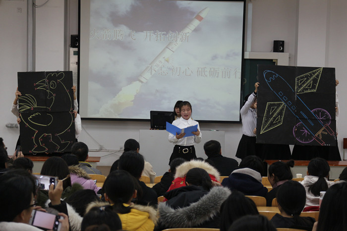 简笔画辅导员们以《初梦》为题现场作画,小黑板拼成一副古代学习场景。英语口语辅导员们以《Dreams》为题目,动听的歌声唱出当代大学生的梦想,优美的英文朗诵打动人心。三笔字辅导员们以《自强不息 方得始终》为题目现场用粉笔写了“天行健君子以自强不息, 地势坤君子以厚德载物”等励志句子,在小黑板背面写了大大的“不忘初心,坻砺前行”。数图辅导员们以《不忘初心砥砺前行》为题,用简图和数学用具组成的大火箭表示中国不忘初心定将实现梦想。经典诵读辅导员们以《追求梦想》为题目,用吟诵和朗诵的方式向我们展现了中华传统文化的魅力。英语书写辅导员们以《青春拂晓圆梦今朝》为题目向我们展现了多种英语字体,并解说了英语书写的注意问题,最后用现画的册子给我们展现了英语的生动。辅导员们的表演赢得台下同学们的阵阵掌声。