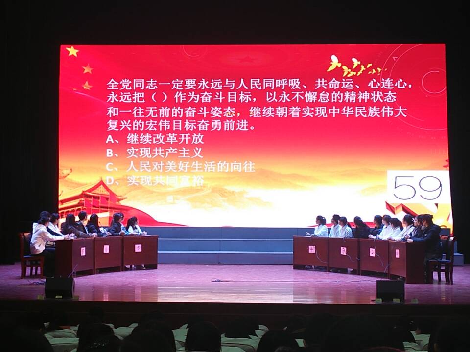 决赛分为必答题环节、抢答题环节、风险题环节和论述题环节四个环节。必答题环节各队选手思路清晰、对答如流,每轮正确的回答都能赢得现场阵阵掌声。在抢答题环节中,选手们针锋相对,你追我赶,反应迅速,抢答激烈,将赛场气氛推向高潮。在风险题环节中,各代表队敢于挑战,纷纷选择高分值的题目进行作答,现场观众热情洋溢的呐喊助威使比赛现场更加紧张激烈。论述题环节,各位选手思路清晰,从不同角度表达对党的十九大精神的理解,代表队们的精彩演讲赢得场下观众阵阵掌声。
