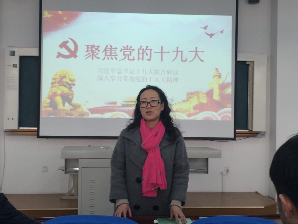 在各党支部组织生活会前,学院邀请基础教育学院高衍玉老师为全体党员进行十九大精神和党章学习辅导,围绕主题为“聚焦党的十九大”展开。报告以十九大内容解读为主线,对十九大内容、意义,以及如何做合格党员、坚定不忘初心跟党走进行了理论解读。使全体党员对“八个明确”的基本内容和“十四个坚持”基本方略有了深入了解,并深刻意识到,党员同志要把思想和行动统一到维护以习近平同志为核心的党中央权威和集中统一领导上来,统一到落实党的十九大确定的各项任务上来。