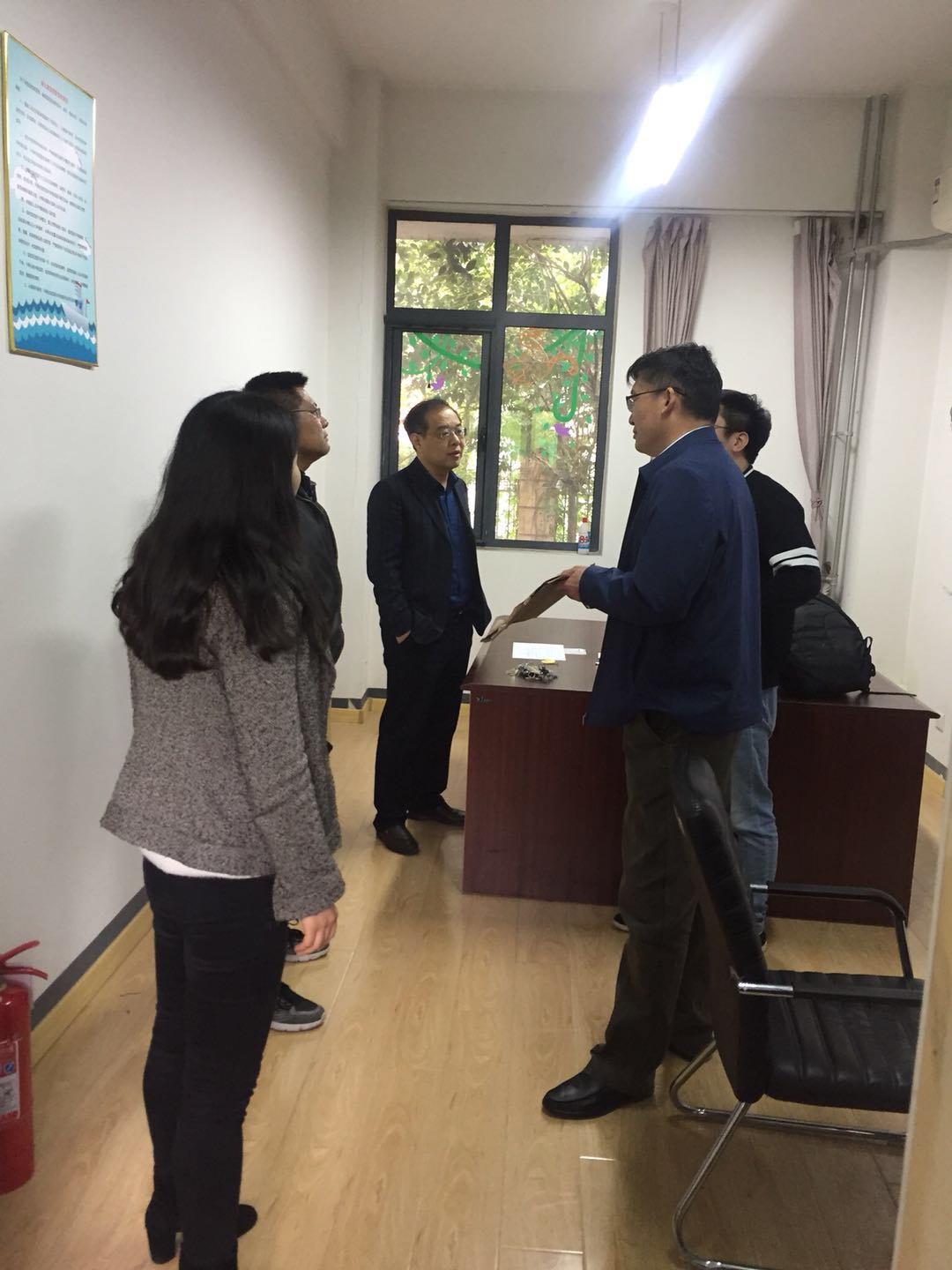 走进活动室,孩子们有礼貌的向好检查人员问好。检查人员查看了环境安全,有序管理,消毒设施齐全,对幼儿园细致地管理工作点头称赞。之后,检查组一行围绕教学楼一圈,分别对走廊、配电室、监控室、幼儿园后门等逐一进行安全检查。同时对一些细节工作提出了指导性意见。