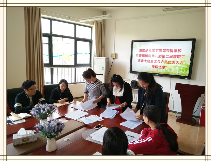 4月25日上午,常春藤幼儿园的教职员工聚集一起,根据《济南幼儿师范高等专科学校第二届教职工代表大会暨第二次工会会员代表大会筹备工作方案》的具体安排,在园领导的支持下,进行了新一届教职工代表大会暨工会会员代表大会换届选举。本次改选活动由徐青园长主持,会上,工会负责人刘佳老师做了《工会工作总结报告》。随后,大会以无记名投票等额选举的方式产生了新一届工会成员。全体会员严格按照换届程序从工会会员中进行投票,并当场公布了选举结果,整个选举过程流畅、公正、透明化。