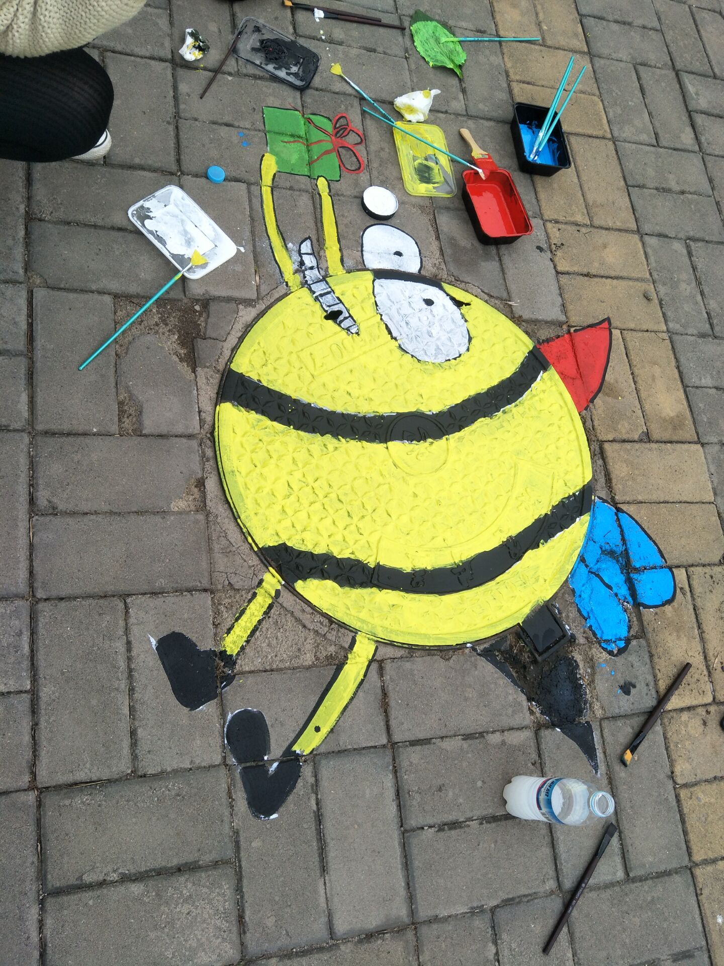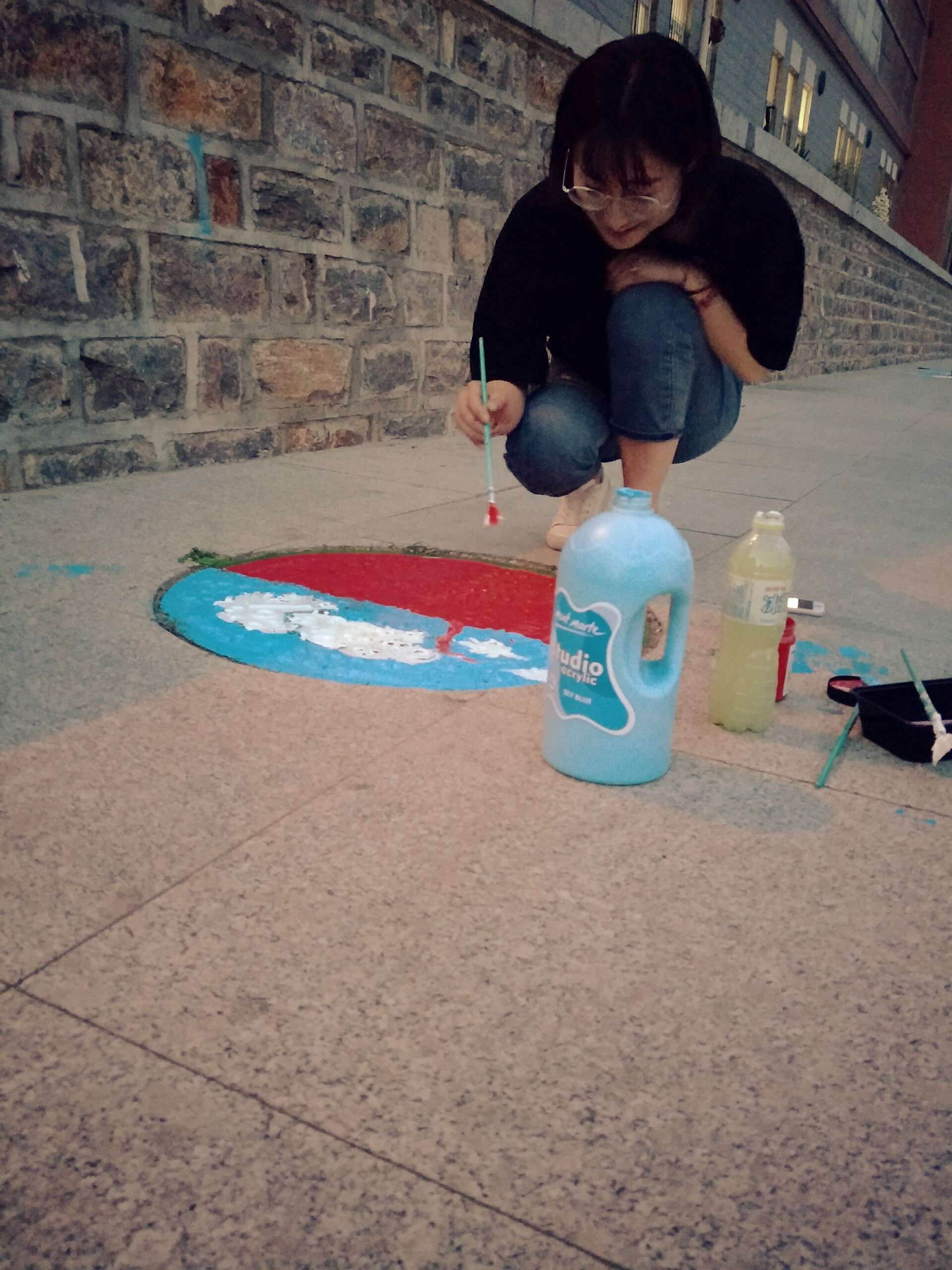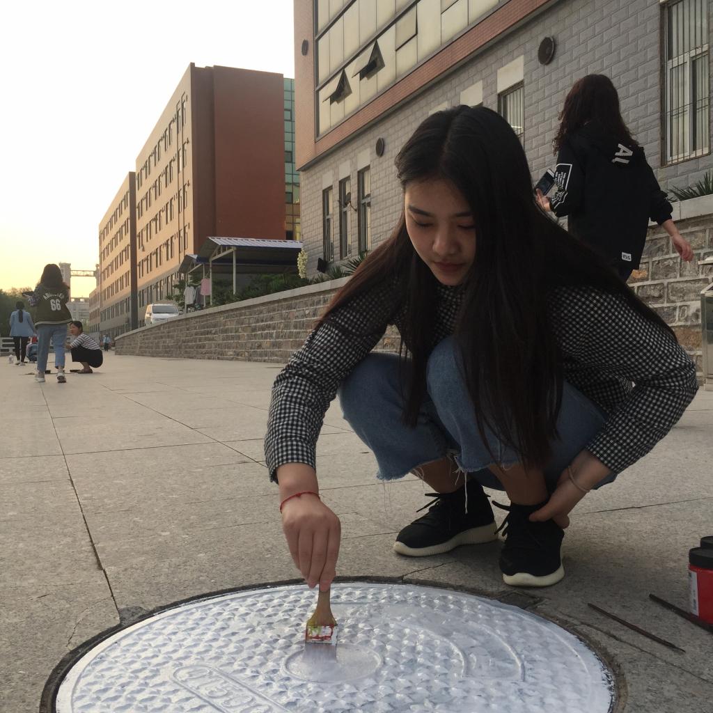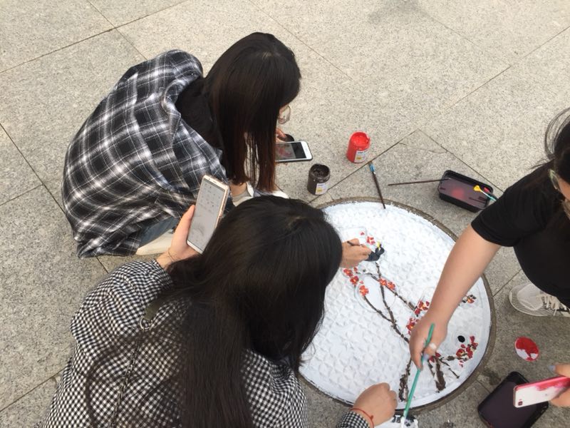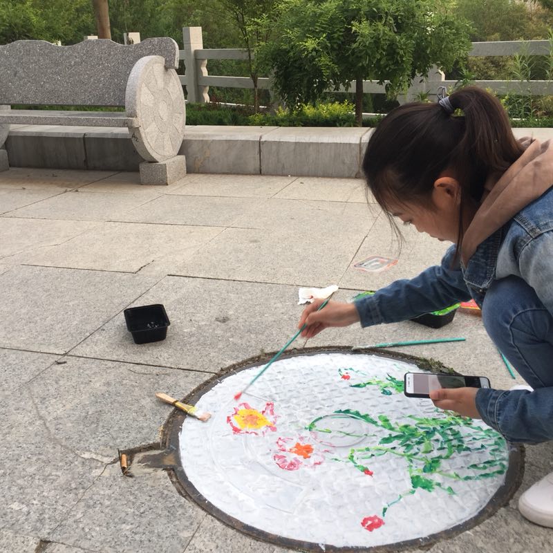 “当看到这些灰色的井盖因同学们的巧手而变得如此靓丽,顿时觉得无比骄傲,虽然很辛苦但我们很快乐”。一位参与井盖涂鸦的同学这样回答。