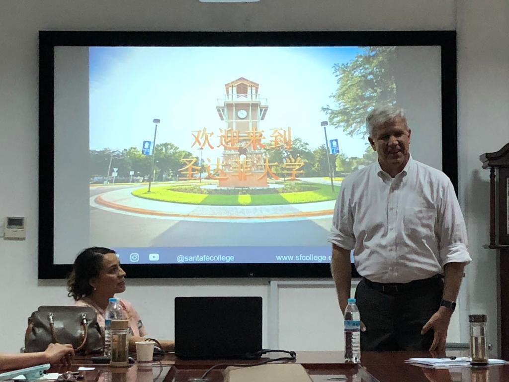 6月13日-14日,美国圣达菲大学校长Edward Bonahue ,Ph.D.(爱德华.博纳辉博士)和国际学生服务处处长Angelica Suarez,MPA(安吉丽娜.斯沃兹)来到我校在学前教育学院317会议室与部分老师开展学术交流活动。初等教育学院英语教研室的老师们参加了这次会议。此次会议老师们就美国早期教育现状,圣达菲大学人才培养情况,及双方教师都感兴趣的话题进行了交流。通过交流,老师们了解了圣达菲大学的办学思路及相关的办学模式,并对佛罗里达州的幼儿教育现状有了更全面地了解。