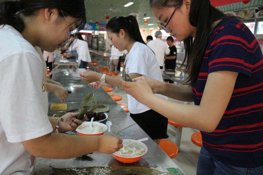 李老师和同学们早上八点在学校餐厅二楼和餐厅工作人员一起包了粽子,上午十点半300多个爱心粽子热腾腾的出炉。大家顶着艳阳,徒步前往皇姑井村。