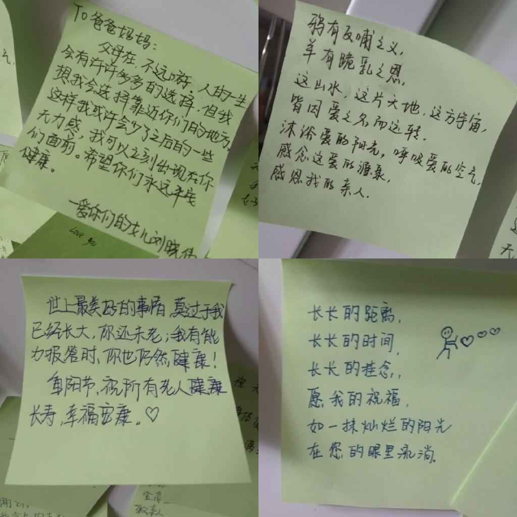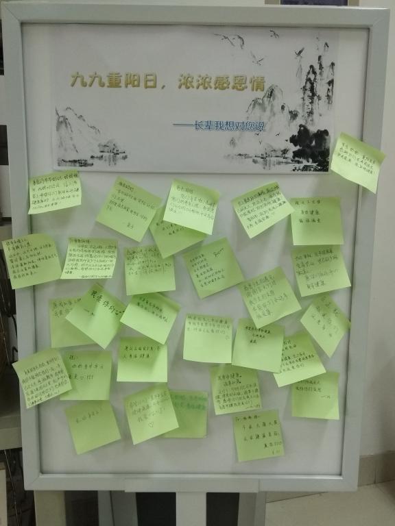此外,还设置了“九九重阳日·浓浓感恩情之长辈我想对您说”留言板,同学们踊跃参与,把想对长辈说的话表达了出来。