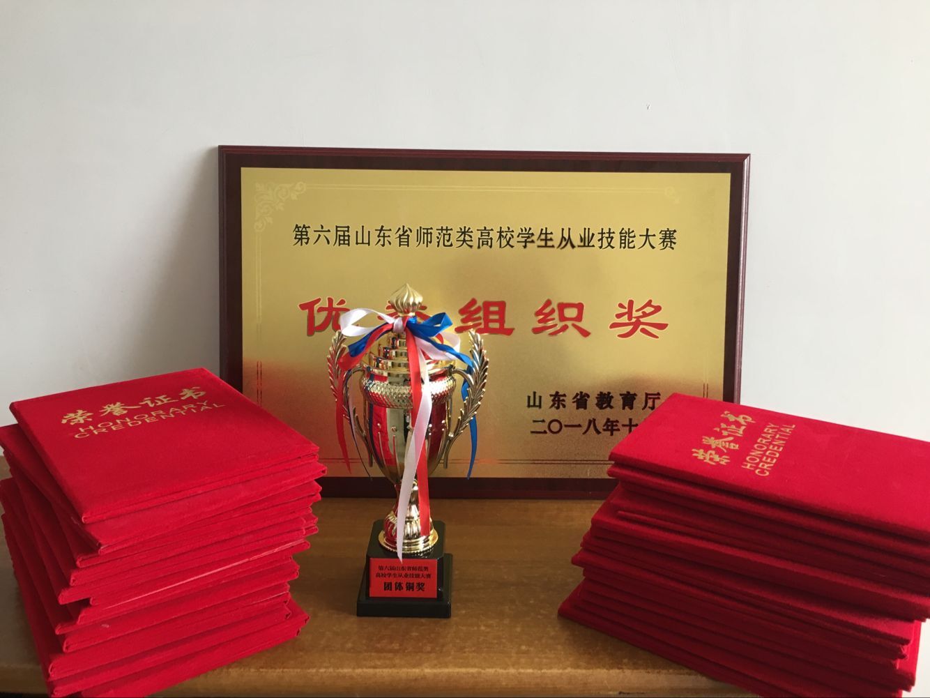 按照大赛规程和参赛名额分配,我校共派出9名学生参赛,其中学校推荐选手5名,教育厅在我校全部2019届毕业生中随机抽取选手4名。经过激烈的角逐,我校学生魏明阔、张琪分别获得了学前教育学段、小学学段一专多能一等奖,贾凝、陈淑慧、李晓菲分别获得学前教育学段、小学数学学段、小学语文学段二等奖,戴晓薇、杜雅琪、房建华分别获得小学数学学段、小学英语学段三等奖,5名选手在钢笔字考察中被评为A级,李媛、李奎艳、赵宝荣三位老师获得优秀辅导教师奖。最终,我校按总成绩排名获得本届大赛团体铜奖,同时荣获了大赛优秀组织奖。