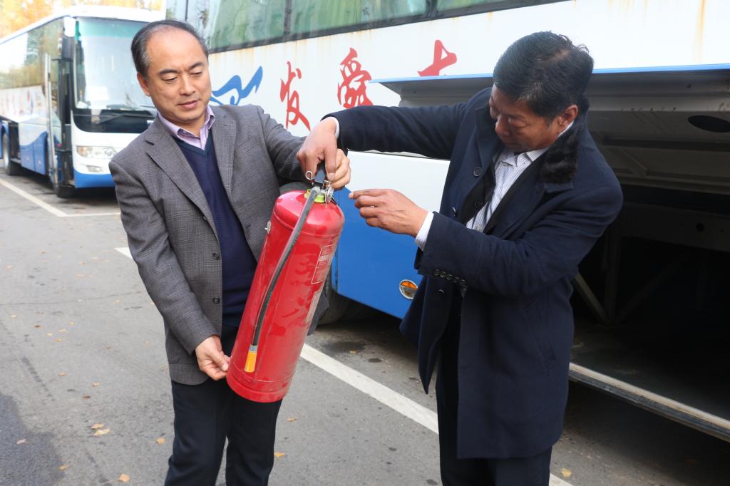 11月13日上午九点,副校长张传银、校安全处副处长王利、负责学校班车工作的孙秋文主任、山东舜发汽车服务有限公司总经理徐拥军等人一起对校车的车容车貌、卫生状况、配备设施、灭火器及司机的休息室进行了安全检查。