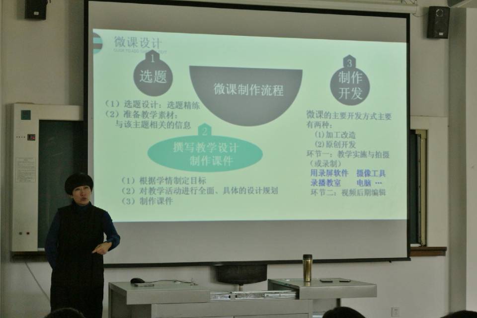 李老师用生动有趣的语言向同学介绍了微课的由来、微课的概念及特点、微课的设计制作及评价,并通过实例视频播放让同学们对微课有了更深的认识,为今后的参赛做好准备。
