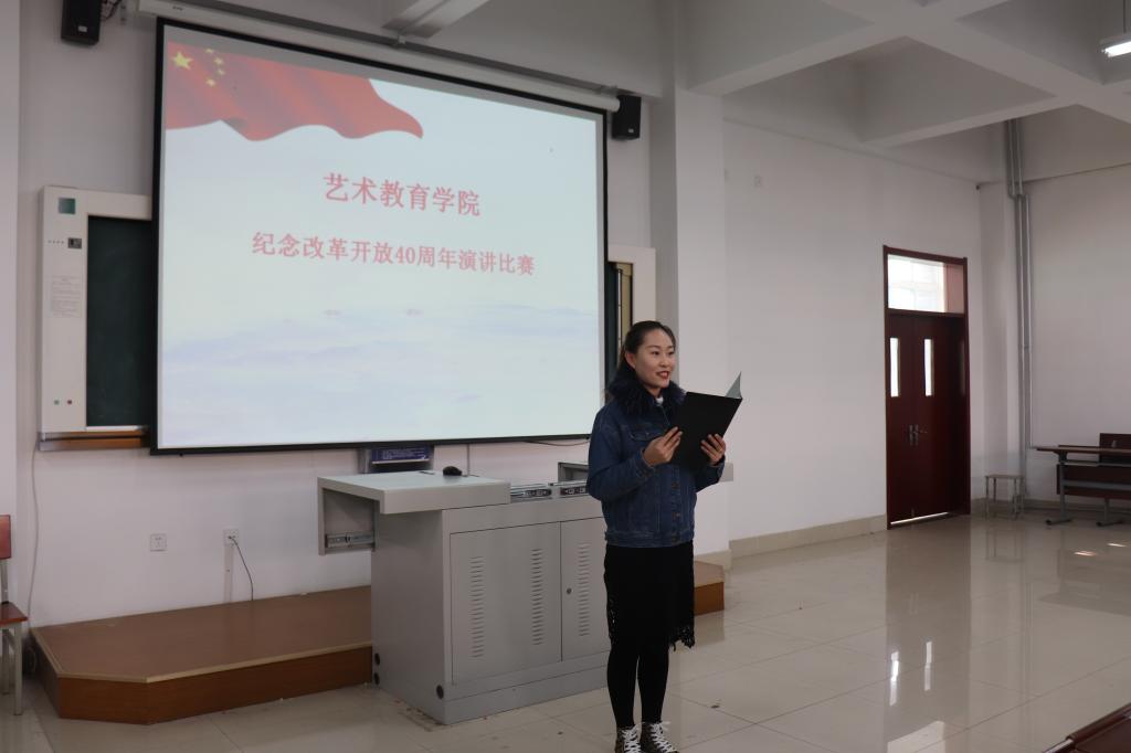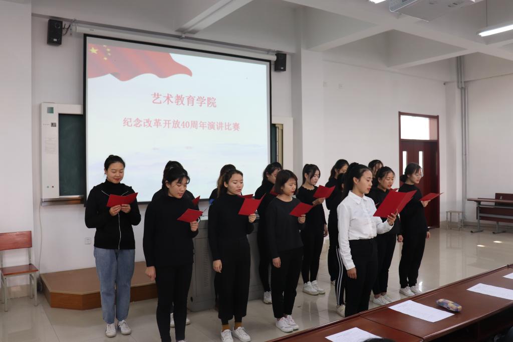 为了隆重庆祝改革开放40周年,讴歌40年来祖国的辉煌成就,教育引导学生更加坚定信念跟党走,持之以恒投身到改革发展之中。11月26日,艺术教育学院全体学生在阶梯十一教室组织开展以“庆祝改革开放四十周年”为主题的演讲比赛活动。