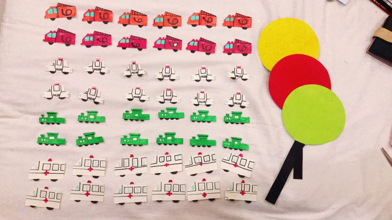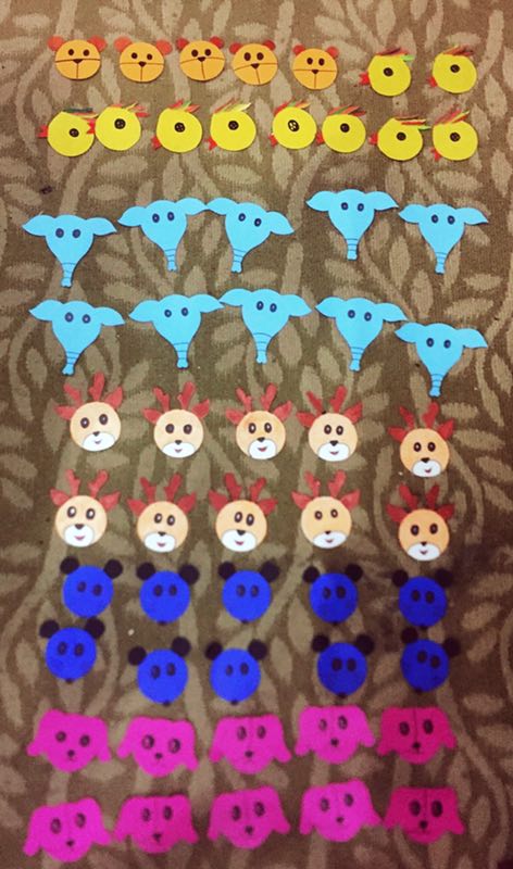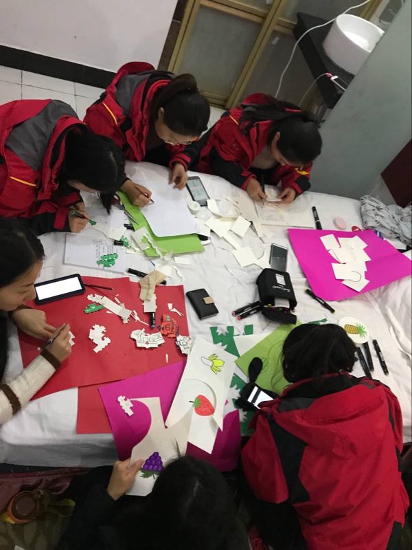 下午放了学,赵越和支教学生开启了一天中最忙碌的时刻。房间里没有合适的桌椅,为了准备好第二天的教具,赵越带着支教学生蹲在地上、趴在床上开始做每个小朋友的教具。“我们要把每一份教具做的基本一样,以免小朋友看到与其他小朋友教具不同,心理上产生其他想法。”精益求精是她们追求的品质,在床前蹲上三四个小时是经常的事情,腿麻的时候就站起来活动活动,之后,再回到原处认真地画着教具上的每一个细节。