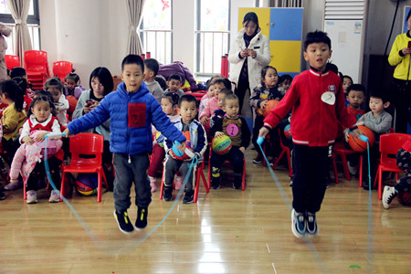 赛场上,活泼可爱的小班年级组率先出场。年龄虽小,但孩子们在场上的表现确实可圈可点,孩子们个个动作敏捷、节奏准确,皮球在小小的手中自由跳动。朝气蓬勃的中班年级组上场了,只见篮球在孩子们两手之间起落自如、自由跳跃,精彩的表现赢得了大家的阵阵掌声。最后出场的是大班年级组,裁判哨声一响,跳绳比赛开始了,孩子们个个身轻如燕,奋力跳跃。一分钟的跳绳比赛时间虽短,但对大班的选手来说体能消耗是很大的。但所有选手都咬紧牙关,坚持到了最后。结束哨声响起,小班和中班的孩子都兴奋的为大班的哥哥姐姐们大声喝彩。大班孩子的坚毅品质也在小班和中班的孩子们的心中埋下了种子。活动结束后,园领导也充分肯定了幼儿们的精彩表现。