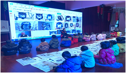 第一环节中,李忠宝老师根据大班年龄特点组织了一堂美术教学活动《猫头鹰》水墨画,对于38位从来没有接触过国画课的小朋友们来说,这真是一场原生态、淳朴自然的国画之旅。伴随着静谧的古琴声,孩子盘腿席地而坐,在老师风趣幽默的教学语言引导下,孩子们气定神凝,大胆尝试,不一会一幅幅颇具创意的幼儿国画就展现在大家面前。新颖的教学方式也让台下的老师们受益颇多。