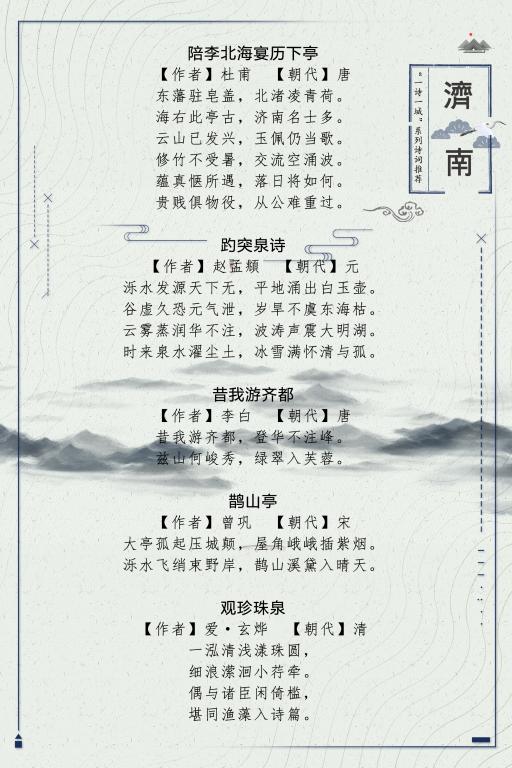 为坚定文化自信,弘扬传统文化,感受千年古诗风韵,营造良好校园精神风貌,图书馆在前两年开展诗词推荐活动的基础上,今年将以“一诗一城”为主题,继续向读者进行推荐。
