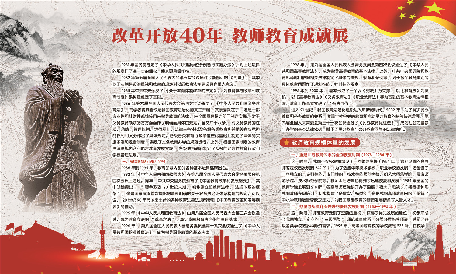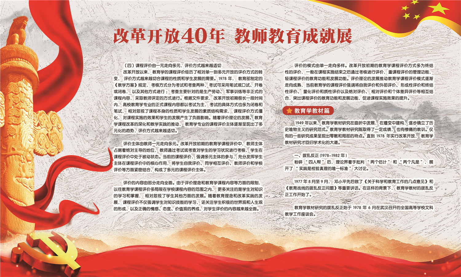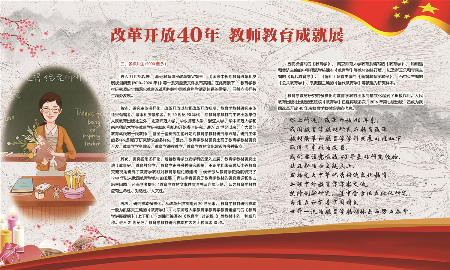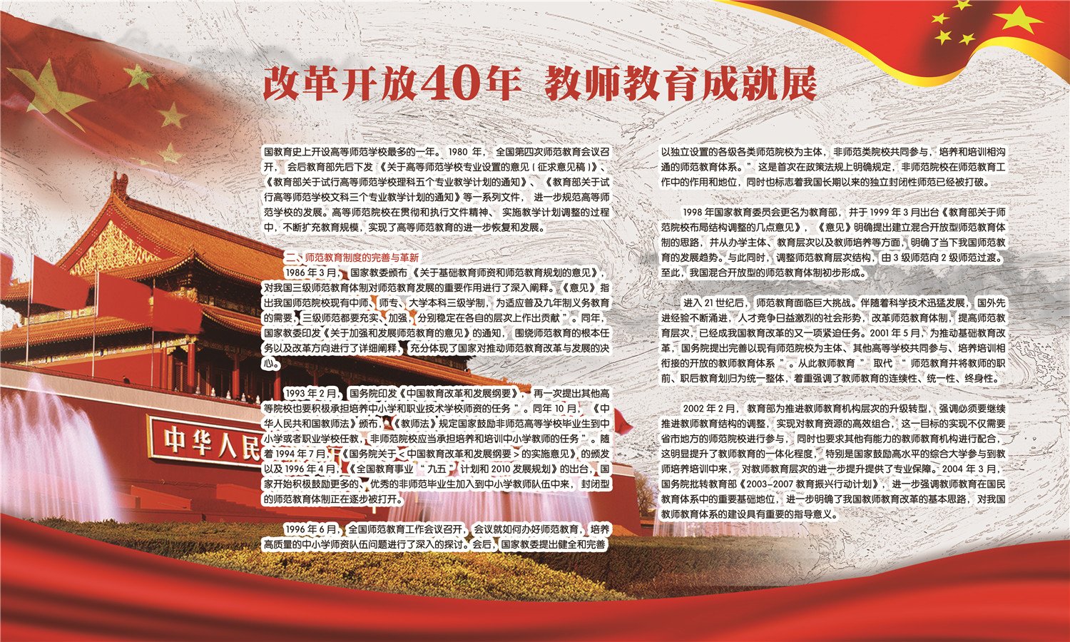 本次成就展分为教师教育政策发展40年、教师教育法制化进程、教师教育规模体量发展、教师教育免费政策历史变迁、教师教育体制结构变化、教育学课程沿革与教材建设等六个部分,系统全面的反映了改革开放四十年来我国师范教育向教师教育转变的历程和取得的伟大成就。