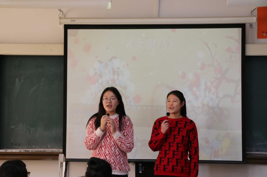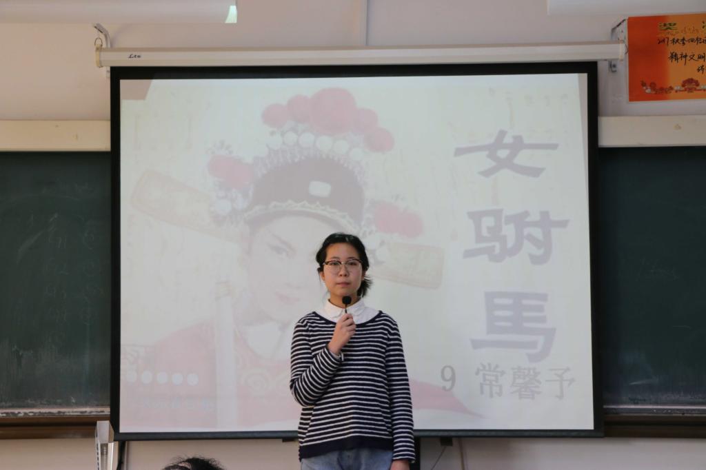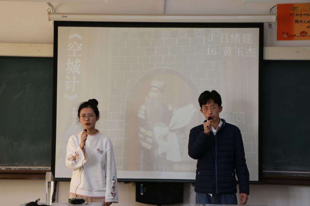“丝竹悠扬、戏韵传神,让我们一起来走进戏曲,走进梨园春秋。”展演以曹锦霞同学的报幕开始,同学们演唱了《苏三起解》、《女驸马》、《天仙配》、《空城计》及《乌盆计》等戏曲里的名段。黄玉杰,常馨予等表演了豫剧《花木兰》,表现了花木兰勤劳、能干以及为国拼杀的巾帼英雄的形象。曹心雨,曹锦霞等人带来的《苏三起解》,一唱三叹,将同学们带入了悲伤的氛围。一个个戏曲唱段赢得了大家的阵阵掌声,带动了全场气氛。在同学们的热情邀请下,肖文健老师为大家表演了一段山东梆子《一大归来》,同学们都陶醉其中。